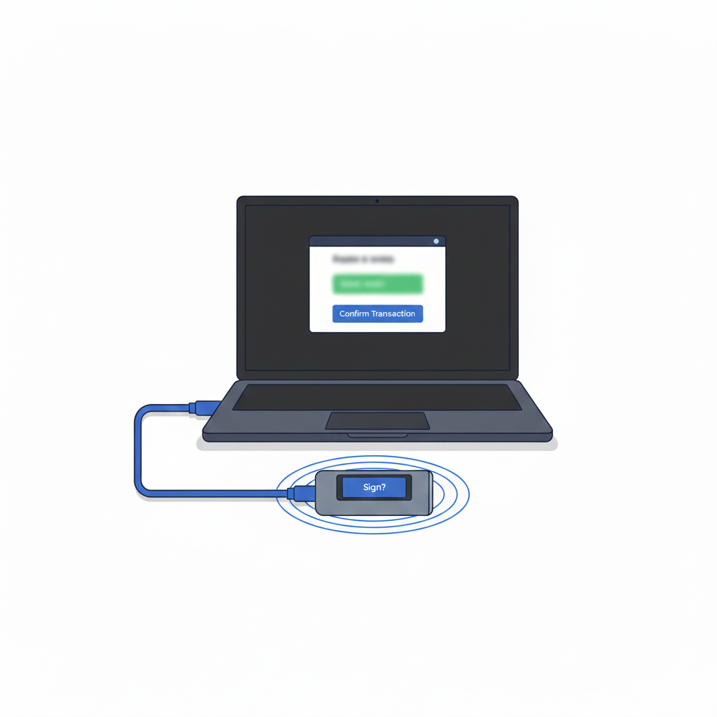 Quando você quer fazer uma transação, o software no computador envia os dados para o dispositivo, você aperta um botão físico na hardware wallet para assinar, e ela devolve a transação assinada para a rede. A chave privada nunca sai do aparelho. É a barreira física definitiva entre seu dinheiro e o mundo digital perigoso.